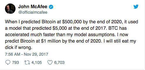 - 亿万富翁John McAfee也曾高调的大V发推文表示:2020年比特币必到50万美元一个。2017年底比特币惊人的暴涨到2万美元以后,John McAfee变本加厉补充道:“比特币将在2020年升至100万美元。如果我错了,我会吃了我的dick。”