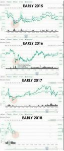 今年比特币在1月7日触顶、市值达8350亿美元,九天过后,市值狂跌55%,也许已经接近底部。WhatsApp虚拟货币群组疯传的图表更显示,比特币从2014年起,每年都在一月份大跌。